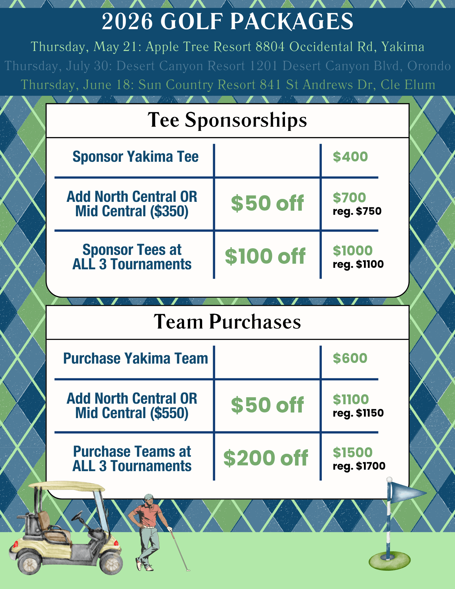 Get ready to tee off at our newest tournament addition—the 2026 Golf Classic: Mid Central at the beautifully maintained Sun Country Golf Course in Cle Elum! Set among the scenic Cascade Mountains, this relaxing yet competitive getaway promises a memorable day on the course.